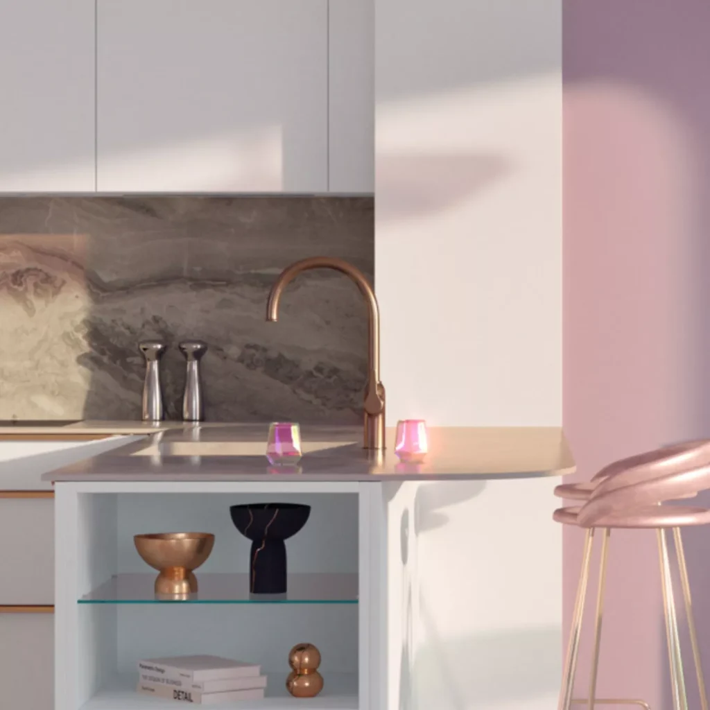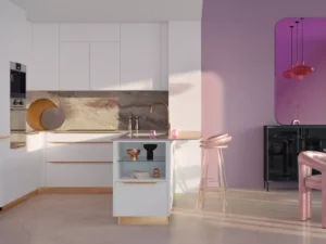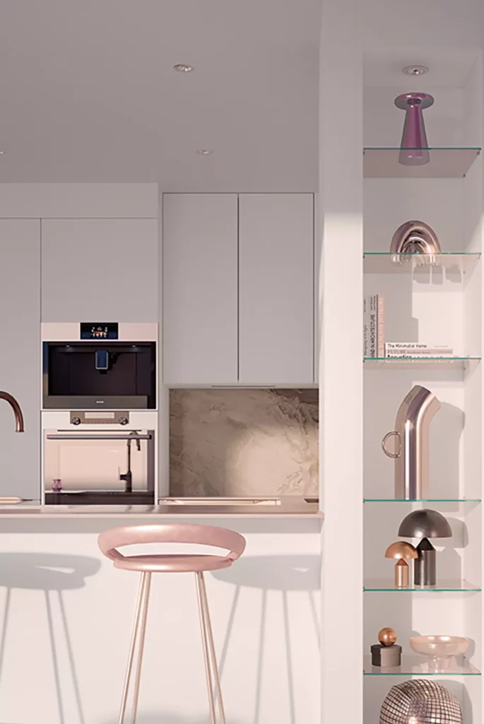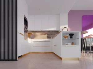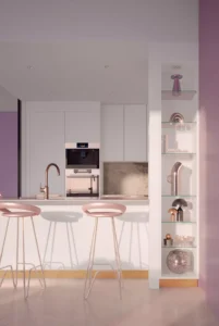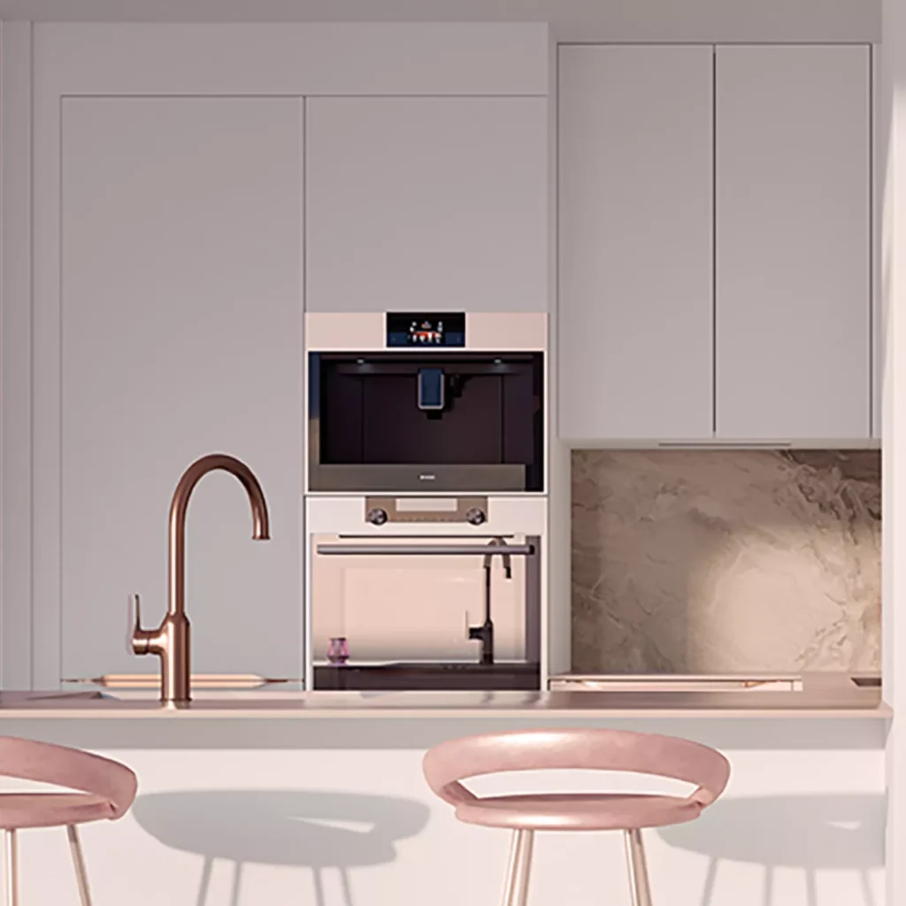 Une cuisine contemporaine dans un univers futuriste, inspiré du charme du premier Space Age des années 60 et 70. Une ode à l’avenir, où les formes organiques souples et les matériaux modulables se marient pour créer une esthétique à la fois élégante et résolument moderne.